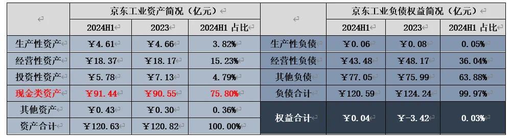 根据招股说明书显示,京东工业2024年上半年总资产为120.63亿元,轻资产运营下生产性资产仅有4.61亿元,占资产比重仅3.82%;