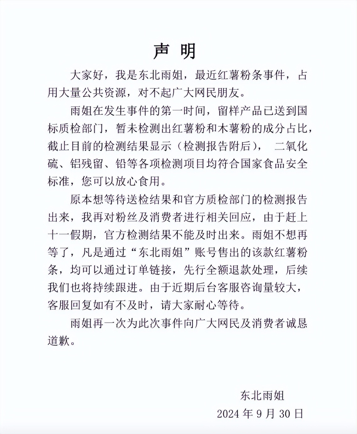 声明还提到,由于赶上十一假期,官方检测结果不能及时出来。凡是通过“东北雨姐”账号售出的该款红薯粉条,均可以通过订单链接,先行全额退款处理。