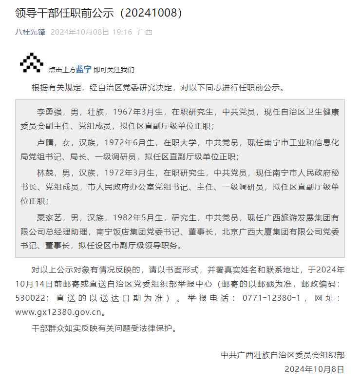 对以上公示对象有情况反映的,请以书面形式,并署真实姓名和联系地址,于2024年10月14日前邮寄或直送自治区党委组织部举报中心(邮寄的以邮戳为准,邮政编码:530022;直送的以送达日期为准)。举报电话:0771―12380―1,网址:www.gx12380.gov.cn。