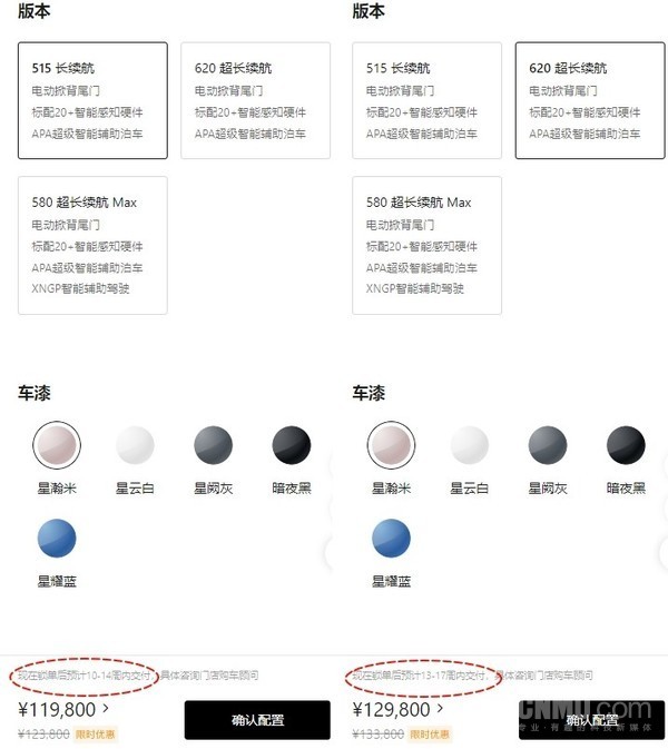CNMO查询小鹏官网后发现,MONA M03 515长续航版的交付时间预计为10-14周,而620超长续航版的交付时间预计为13-17周。这一交付时长相比上述销售说的又增加了1周,说明这款车确实面临“卖得快,交得慢”的“幸福的烦恼”。
