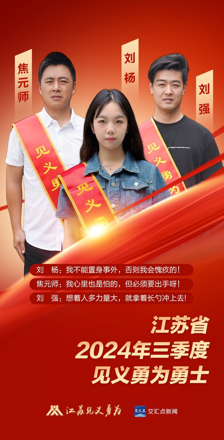 10月9日,江苏省见义勇为基金会发布2024年三季度“省见义勇为勇士榜”,共有10位见义勇为人员光荣上榜,其中包括在苏州姑苏区中张家巷口伤人事件中临危不惧,奋勇阻止歹徒行凶的“碎花裙女生”刘杨和“大勺哥”焦元师、刘强。