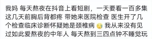 还有网友的爹妈突发颈椎病,再三询问后才知道,是晚上不睡觉熬夜刷短剧闹的。