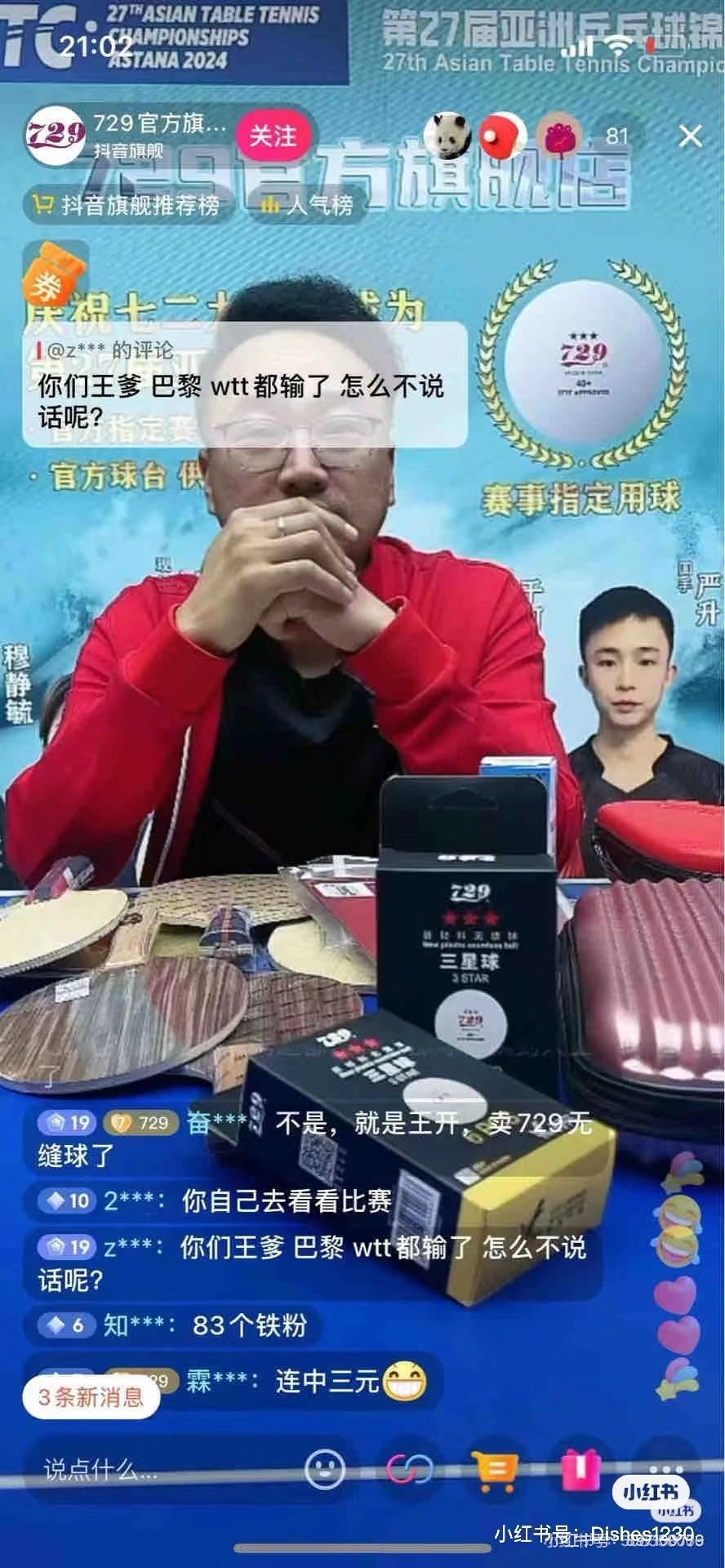 比赛用品不同让不少球迷到“729官方旗舰店”直播间反映此问题,而直播间直接将关于讽刺王楚钦的评论置顶。