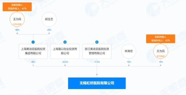 据天眼查显示,无锡虹桥医院的实控人是王为民,直接、间接共持股42%;第一大股东美迪亚集团,直接持股40%;王为民也是美迪亚集团的实控人,直接持股80%。