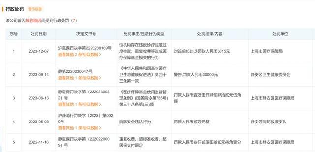上海健桥医院于2023年12月,因存在违反诊疗规范过度检查,重复收费等造成医疗保障基金损失的行为 ,被罚6315元;2023年6月,因违反《医疗保障基金使用监督管理条例》相关规定,被罚1500元;2022年11月,因重复收费、超标准收费、超医保支付限定,被罚3200元。