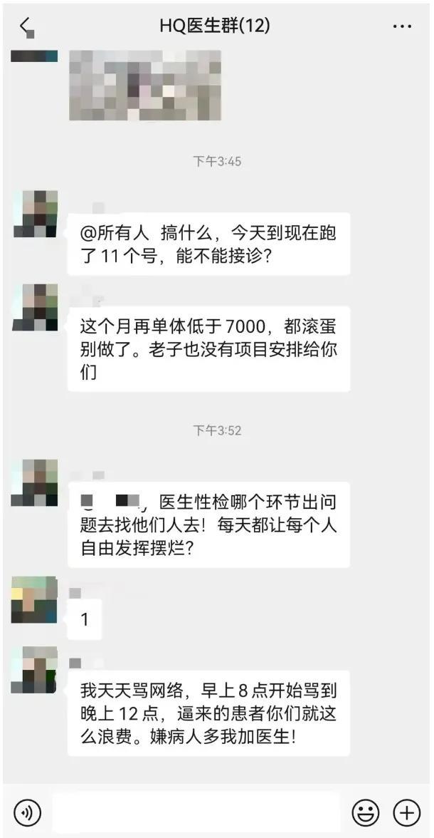 在外界看来,昆山虹桥医院被调查也并不意外。最近,昆山虹桥医院被曝“要求患者消费到7000元”。8月,有网民发布的一张“HQ医生群”的群聊截图显示,一位名为陈某某的人员发消息,“这个月再单体低于7000,都滚蛋别做了。”
