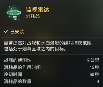 最后要提及的就是斯维亚的主要侦测技能——监视雷达了。这里她使用的是格但斯克分线的短持续时间,快装填时间的版本。使用灵活度更高,但是持续时间极短,可以结合雷达插来提升对敌方驱逐舰的针对效果,但整体作战思路还应以持续驱赶以及消耗为主。