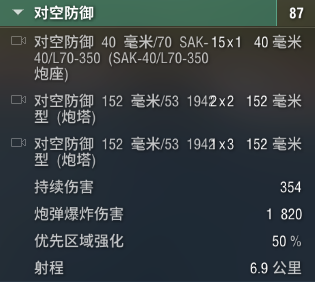 防空火力方面,斯维亚与朗纳尔非常类似。其防空火力纸面数据并不差,尤其是防空范围,152炮能射6.9千米,属实可怕。40毫米博福斯也是大家熟悉性的款式。但核心问题是斯维亚没有AA消耗品,没办法超级加倍,所以实际防空效能也要打个问号。最后顺便提醒一下,斯维亚也属于马耳他AP舰爆的“腐乳”范围,千万要多加小心。