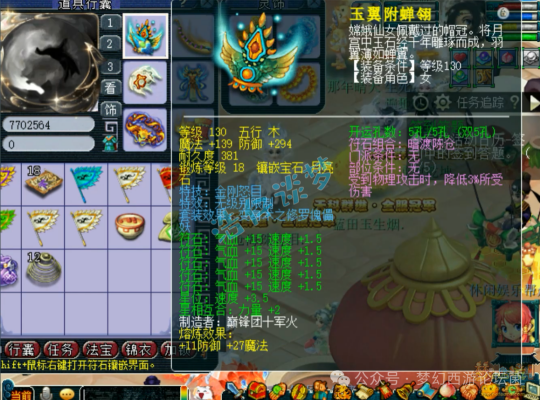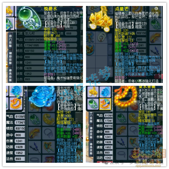 戒指和耳饰下排都是三速度。配饰下排双防御一法防,手镯下排双气血一法防,两件都是140级超级简易。4个灵饰全部打了11锻星辉石,特效都是8级163。