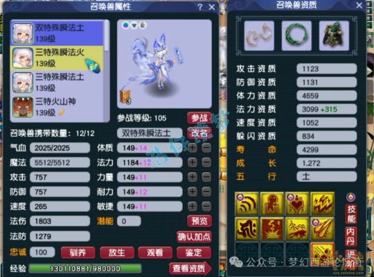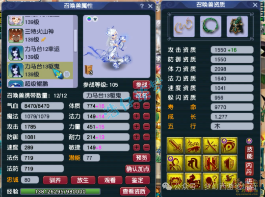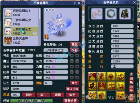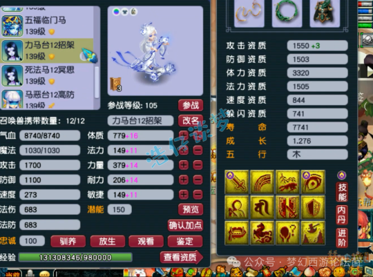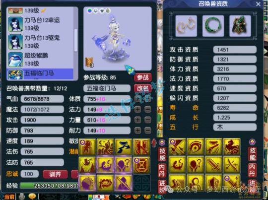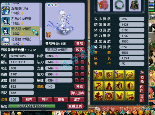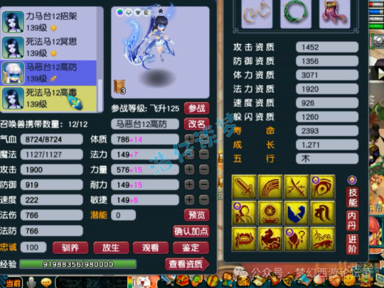 12技能死亡法防净台神马画魂,赐福了4个超级技能,他仓库还有很多宝宝,我就不一一展示了!好了,这个就是这个129级女儿村全号了,看完真的无法用言语形容,只能说太牛了!这种号就是全服唯一,也是全服第一的存在,至少目前已知的没有比她还强的号!