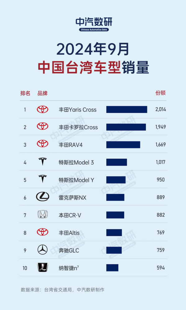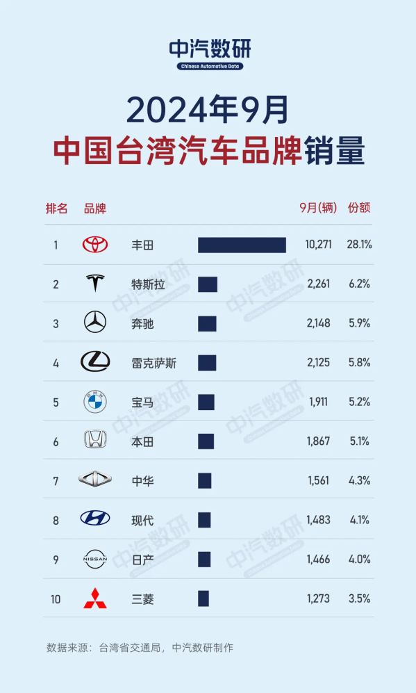 近日,中国台湾省9月份汽车销售情况和各品牌及车型的市场表现出炉。据智车派了解,在品牌销量方面,丰田、特斯拉和奔驰排名前三。