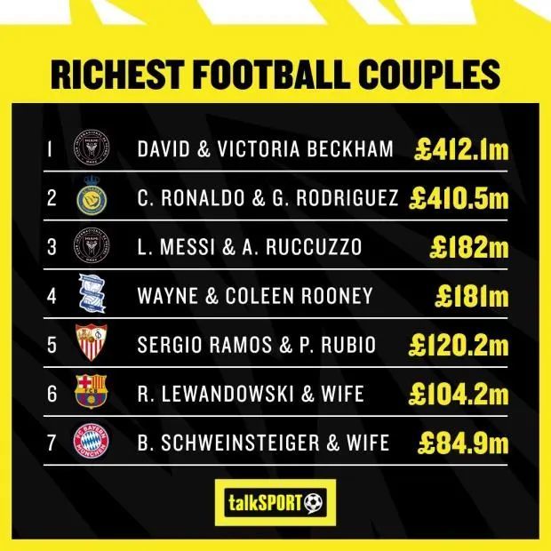 这些年,这对夫妇的身家财富也是不断飙升,在全球足坛最富夫妇的榜单中排名第三,仅次于贝克汉姆和C罗这两对。