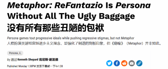 近日,知名游戏外媒kotaku编辑Kenneth Shepard发文称“《暗喻幻想》是没有丑陋包袱的《女神异闻录》。”表示“角色扮演游戏理应宣扬进步主义理念,《女神异闻录》系列之前却强调倒退的刻板印象。”这位编辑同样负责kotaku官方对《暗喻幻想》的评测工作,他最近在多个文章与社交媒体批判了Atlus“之前的恐同倾向”。