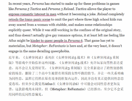 这篇文章长篇大论批判了很久,大致意思只是讲《女神异闻录》以前正常性取向的搞笑或者其他故事情节,以及一些感情戏的设定是“反觉醒”和“恐同”的。虽然后续版本有过删减,但Shepard认为Atlus还是做的不够好。而《暗喻幻想》因为没有感情线和性别笑话值得称赞。