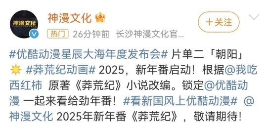 不知不觉已经进入十月,又到了新一轮国产动漫扎堆公布的时间。各大视频平台也纷纷开启了国漫发布会,宣布一波又一波的新作。而这次,某酷视频平台的国漫发布会上,有一部作品成功吸引了众多动漫迷的眼球,那就是根据知名网络作家我吃西红柿大神小说改编的《莽荒纪》。更令人激动的是,这部作品刚刚公布,官方就火速宣布,它将被制作成年番!如此高规格的制作,不禁让人对它充满了期待。