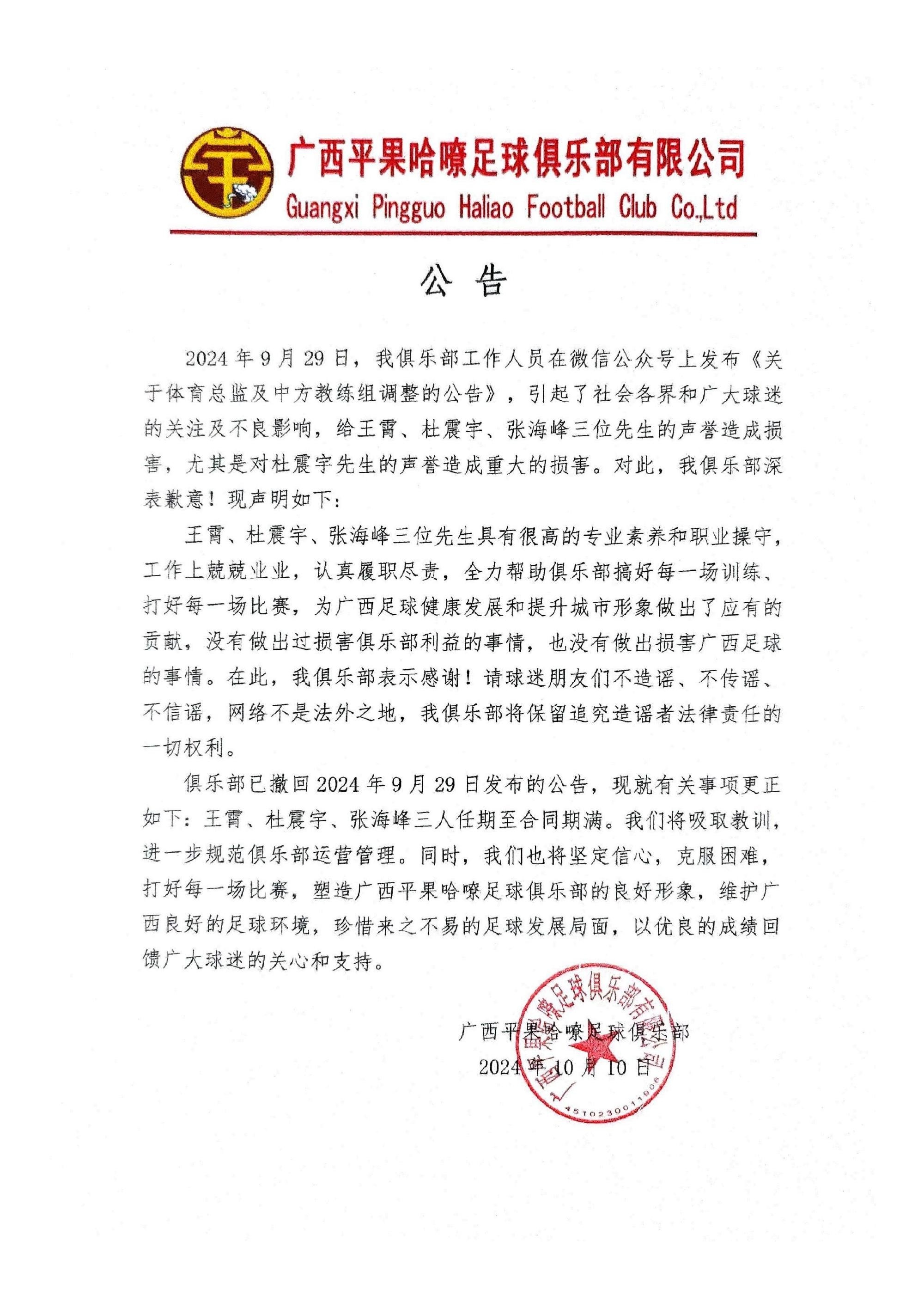 俱乐部已撤回2024年9月29日发布的公告,现就有关事项更正如下:王霄、杜震宇、张海峰三人任期至合同期满。我们将吸取教训,进一步规范俱乐部运营管理。同时,我们也将坚定信心,克服困难,打好每一场比赛,塑造广西平果哈嘹足球俱乐部的良好形象,维护广西良好的足球环境,珍惜来之不易的足球发展局面,以优良的成绩回馈广大球迷的关心和支持。