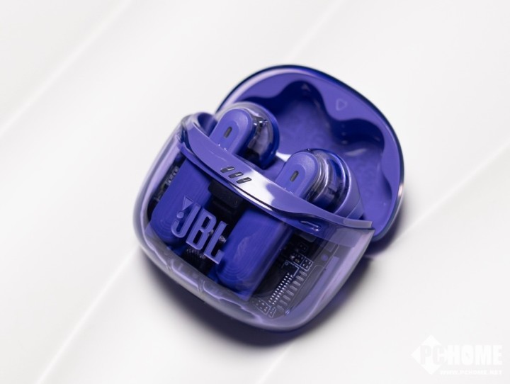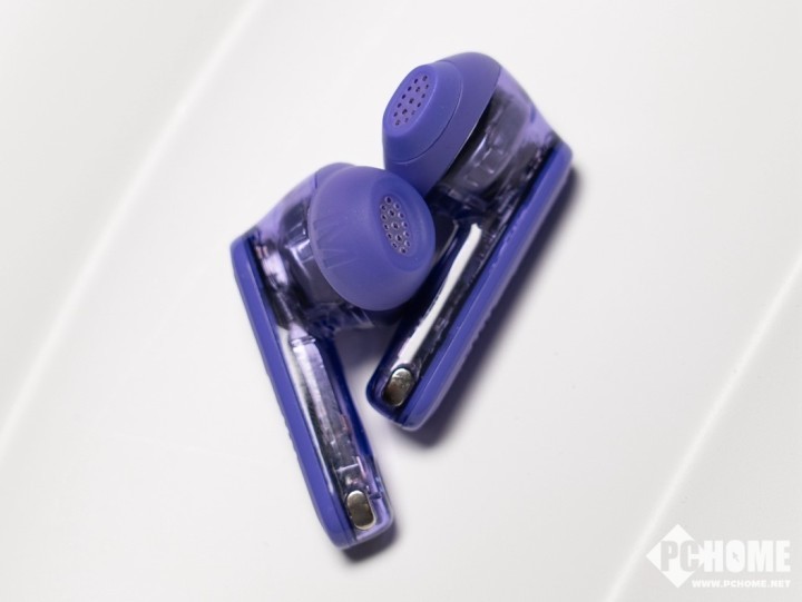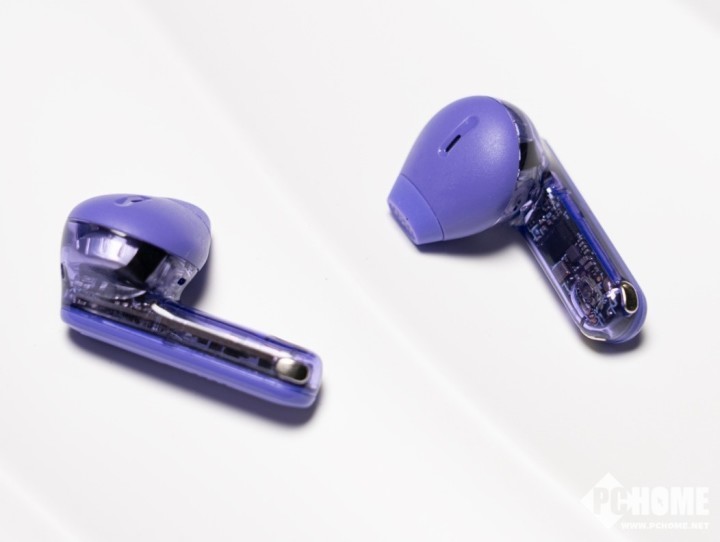 耳机本体方面也同样采用了透明外壳设计,尤其是耳柄部分,内部元器件裸露,显得科技感十足。搭配紫色配色,使其成为耳间独特的时尚单品。