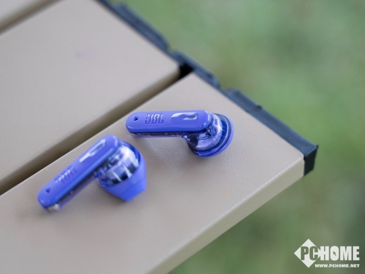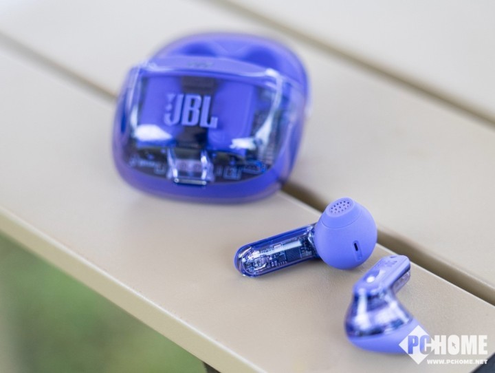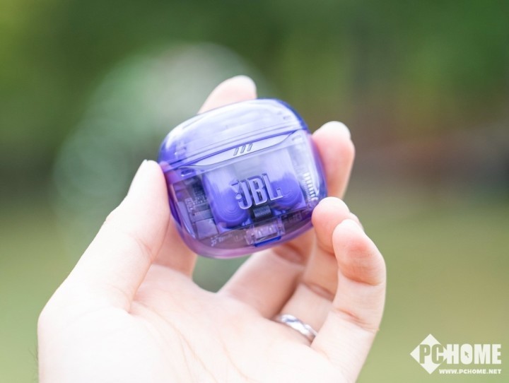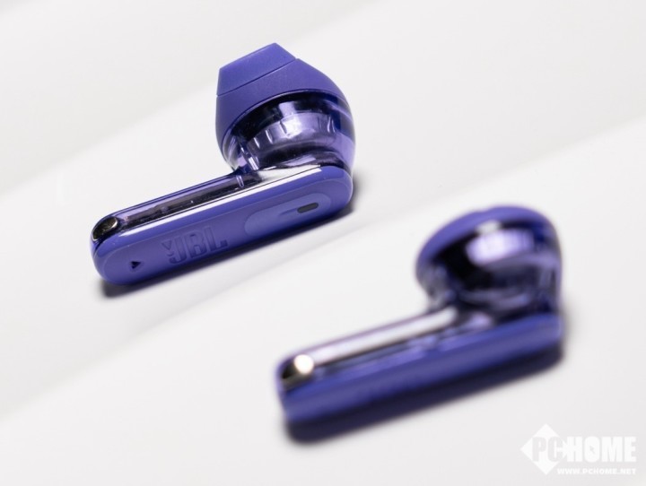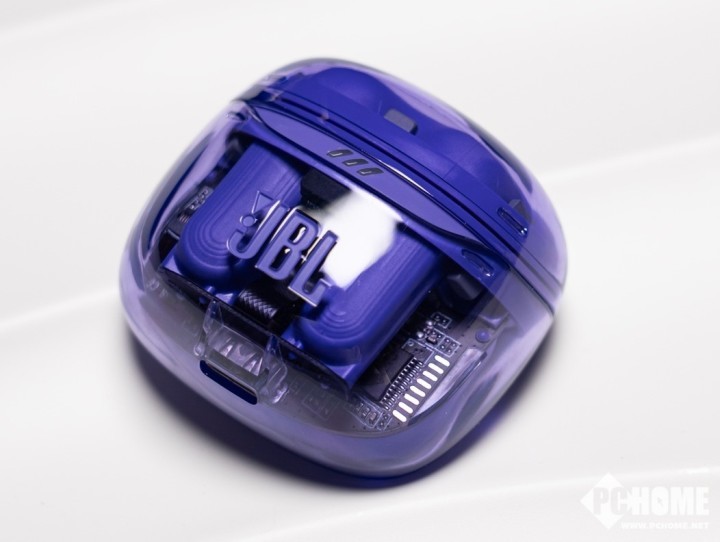 首先从外观上来看,JBL晶噪豆二代的外观设计极具视觉冲击力,透明的外壳将内部精密的元器件展现在用户面前,加之我们这一次拿到的紫色版本,更是赋予了耳机一层神秘的韵味。