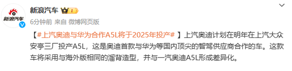 【CNMO科技消息】近日,CNMO注意到,有消息称,上汽奥迪计划在2025年于上汽大众安亭三厂投产新款A5L车型。这款车型是奥迪首款与华为等国内顶尖智能驾驶供应商合作的车,旨在为中国市场带来更高水平的智能驾驶体验。新车将采用与海外版相同的溜背造型,但在智能驾驶和车内配置方面将与一汽奥迪A5L形成差异化竞争。
