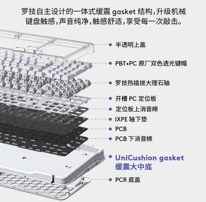 按键拥有40gf触发压力,总键程3.5mm,触发键程1.9mm。罗技自研的UniCushion Gasket大中底方案通过柔性材质包裹内胆结构,并与外壳完全隔离,进一步保证了声音与手感的纯净性。内胆部分还配备了开槽定位板、夹心棉、ixpe轴下垫与轴座棉等主流配置方案,使得键盘在声音与手感上都达到了目前的一 流水准。