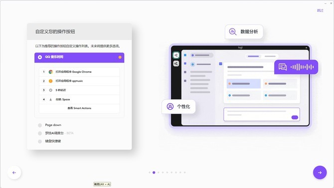 Logi Options+ 应用程序的右上角导航菜单里,包含了一个Smart Actions选项,在这里内置了预定义的可自定义 Smart Actions 模板,可自动执行常见任务,从而减少大量的重复性工作。Smart Actions 模板选项卡包含各种现成的 Smart Actions,涵盖日常用例,您可以快速自定义以满足自己的需求。