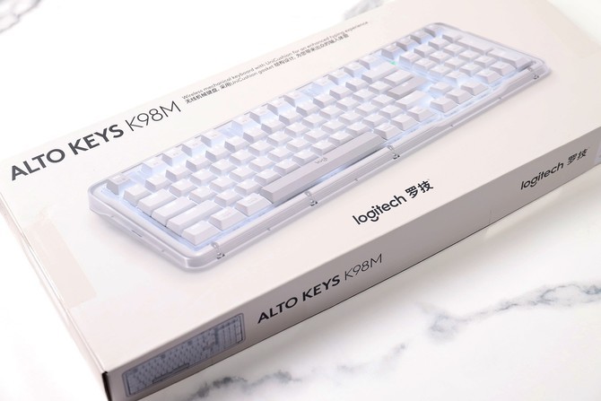 罗技琥珀系列K98M无线机械键盘的包装设计简约大方,正面印有品牌、型号和产品展示图,背面则详细列出了产品特点。附件方面,提供了USB-C接口的充电线材、罗技最 新的Logi Bolt接收器以及产品质保卡。