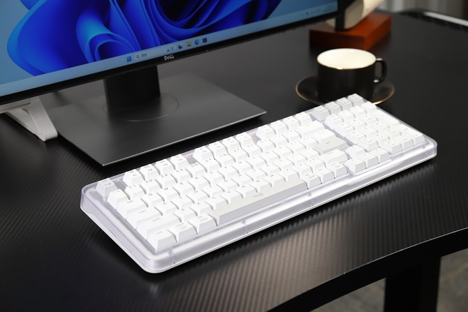 键盘提供了珍珠白、石墨灰、星暮紫三款配色,每款都独具特色。本次评测的珍珠白配色,键盘采用了98键配列方案,相较于传统的104键全尺寸键盘,其长度缩短了约20%,大大提升了桌面的利用率,同时也为鼠标用户提供了更大的移动空间。