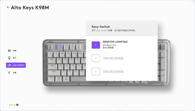 罗技琥珀系列K98M键盘支持Logi Bolt+蓝牙双无线连接方案,USB-C接口仅用于为键盘充电使用。罗技的Logi Bolt无线技术提供了出色的连接稳定性和输入延迟控制,确保用户在使用过程中不会出现断连、卡顿等情况。此外,支持Easy Switch功能,用户可以在已配对的设备中快速切换,比如笔记本电脑、台式机电脑、平板电脑间的切换,这对于多设备用户来说非常友好。