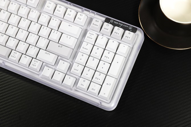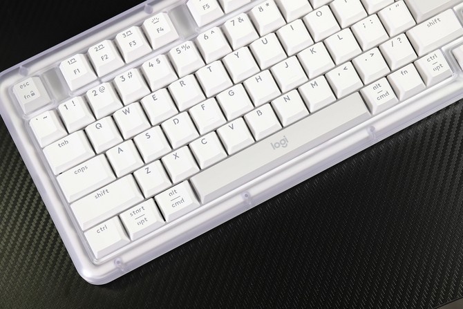 键帽方面,罗技琥珀系列K98M采用了PBT材质,表面做了雾面工艺处理,一个很贴心的体验就是长时间使用不会沾染指纹。键帽的厚度为1.6mm,边角的处理也很柔和,整体做工非常精致。按键的触感细腻干爽,包裹性良好。字符透光设计确保了背光的均匀分布,7档位背光调节功能使得键盘在黑暗环境下也能拥有出色的辨识度与视觉观感。白色背光与字透键帽的搭配更是相得益彰,科技感与美感并存。