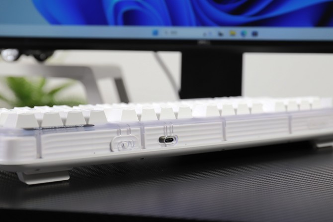 机身顶端设有电源开关与USB-C接口,方便用户为键盘充电或关闭电源以节省电量。