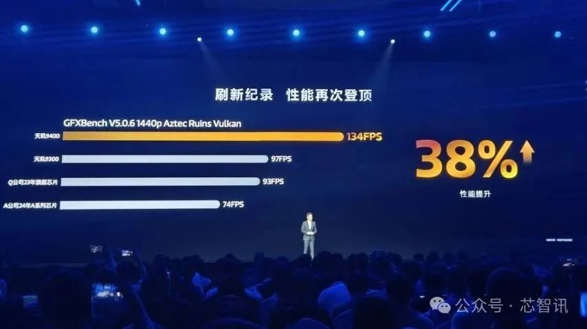 在GFXBench 1440P Aztec Ruins Vulkan测试中,天玑9400达到了134FPS, 相比天玑9300(97FPS)提升了38%,同时也远高于高通骁龙8 Gen3(93FPS)和苹果A18 Pro(74FPS)。