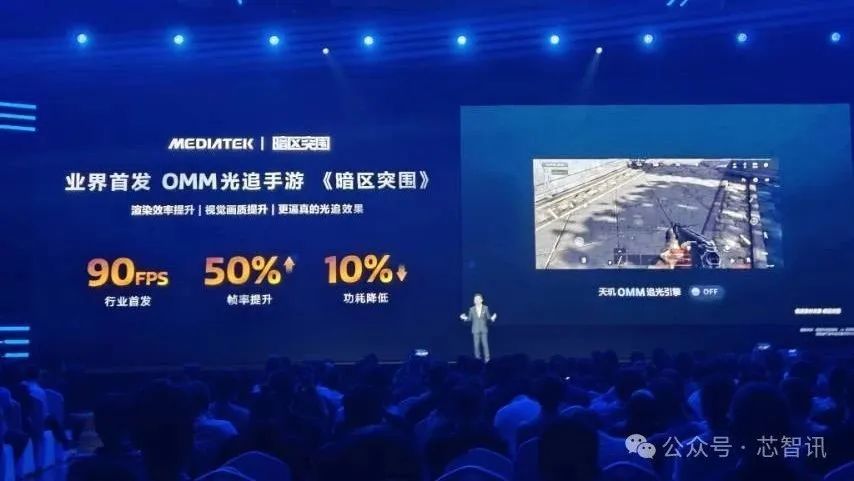 天玑OMM追光引擎不仅带来光追效果的进一步提升,还能大幅降低光追计算的功耗。比如在支持天玑OMM追光引擎的手游《暗区突围》当中,天玑9400可以将帧率提升50%到90FPS,同时功耗还可降低10%。