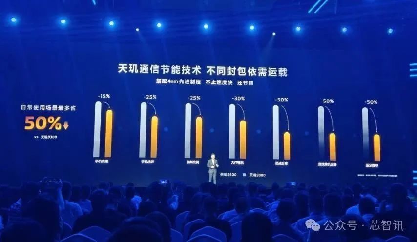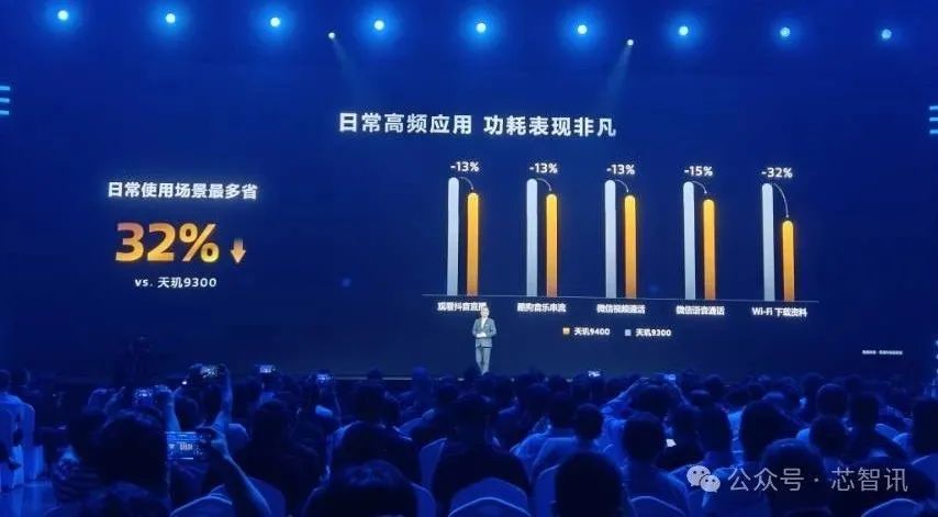 在日常高频应用场景下,比如视频通话、听音乐、看直播等,天玑9400相比天玑9300也能够带来最高32%的能耗降低。