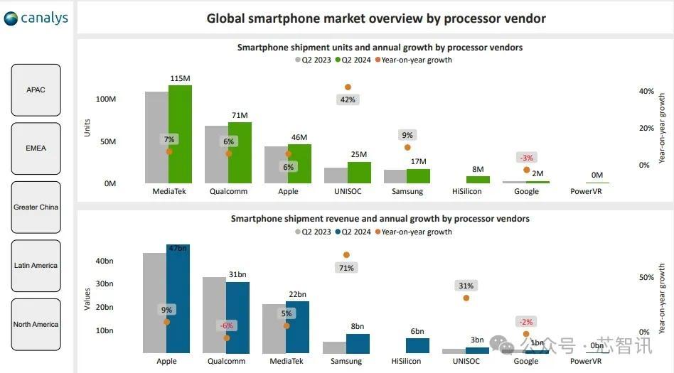 根据市场研究机构Canalys发布数据显示,2024年第二季度,基于联发科处理器的智能手机出货量同比增长7%至1.153亿台,市场份额高达40%,环比增长了1个百分点。以营收占比来看,基于联发科处理器的智能手机的销售额为220亿美元,同比增长5%,在整个市场当中的份额为19%,环比增长2个百分点,同比下滑了1个百分点,但低于出货量份额的同比下滑幅度。这也反映了联发科天玑系列旗舰机型在高端市场的增长强劲。