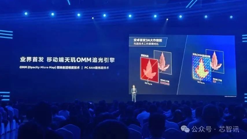 在GPU性能大幅提升的同时,天玑9400还首次将3A大作同级光追技术——天玑OMM追光引擎(OMM,OpacityMicro-Map Engines)带入到移动端,这也是当前一些顶级的独立显卡才支持的第三代光追技术。