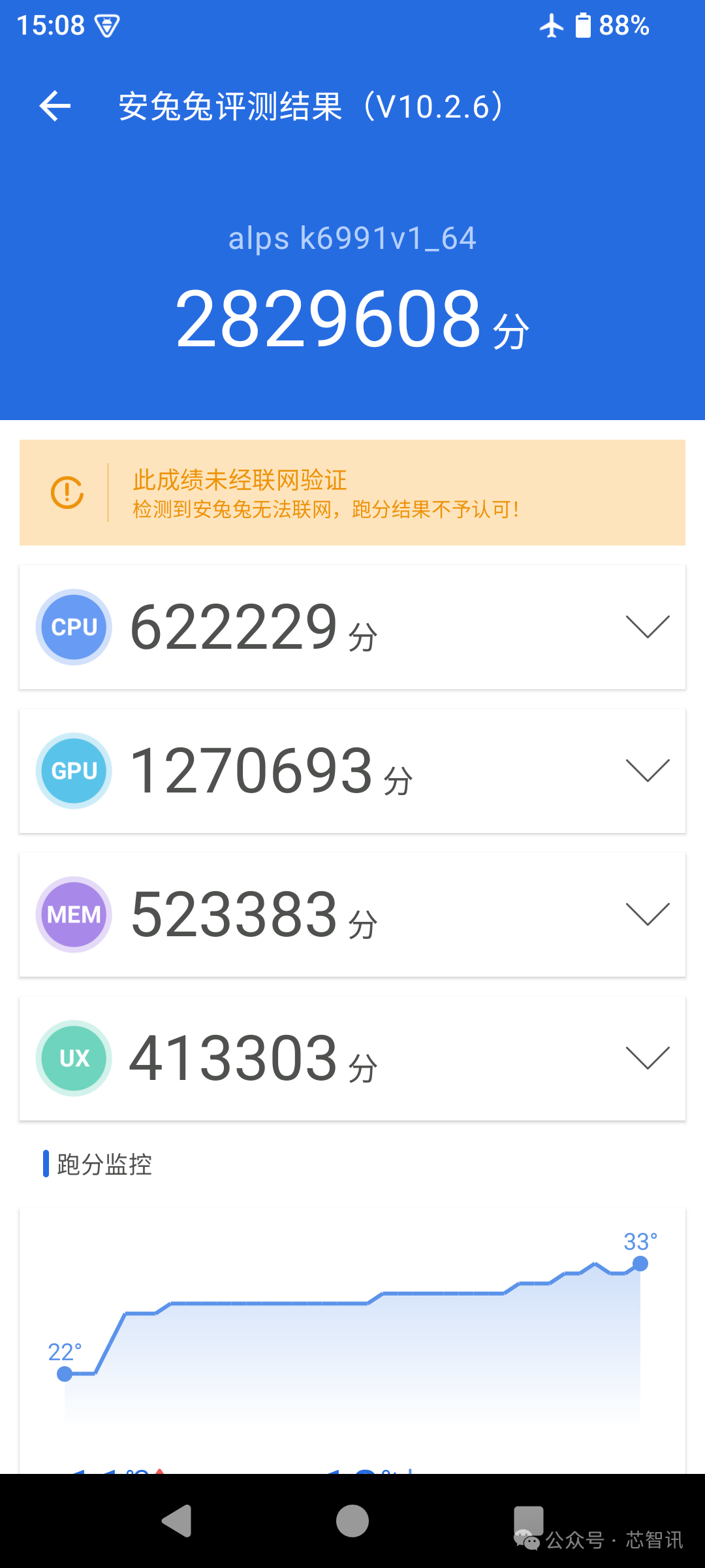 其中,安兔兔跑分实测成绩为2839608分。作为对比,联发科上一代的旗舰芯片天玑9300在实验室环境下的安兔兔跑分也只有220万分,也就是说,天玑9400的跑分成绩一下子提升了29%,足见其性能提升幅度之大。而且可以看到,在安兔兔跑分测试完成后,机器的温度也仅从22℃上升到了32℃,并未出现温度大幅飙升导致的发热问题。