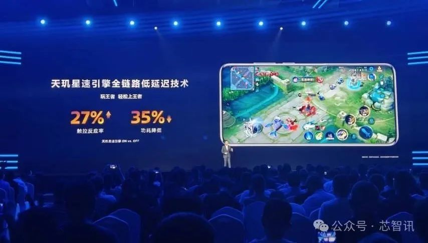 在游戏操控方面,天玑星速引擎还带来了全链路低延迟技术,使得触控响应速度大幅提升。联发科表示,在“星速引擎”的加持下,在《王者荣耀》60FPS运行下, 触控反应提升了27%,达到了70ms(超越iPhone 15 Pro Max 触控延时的79ms),有效的减少了卡顿,功耗也降低了35%。