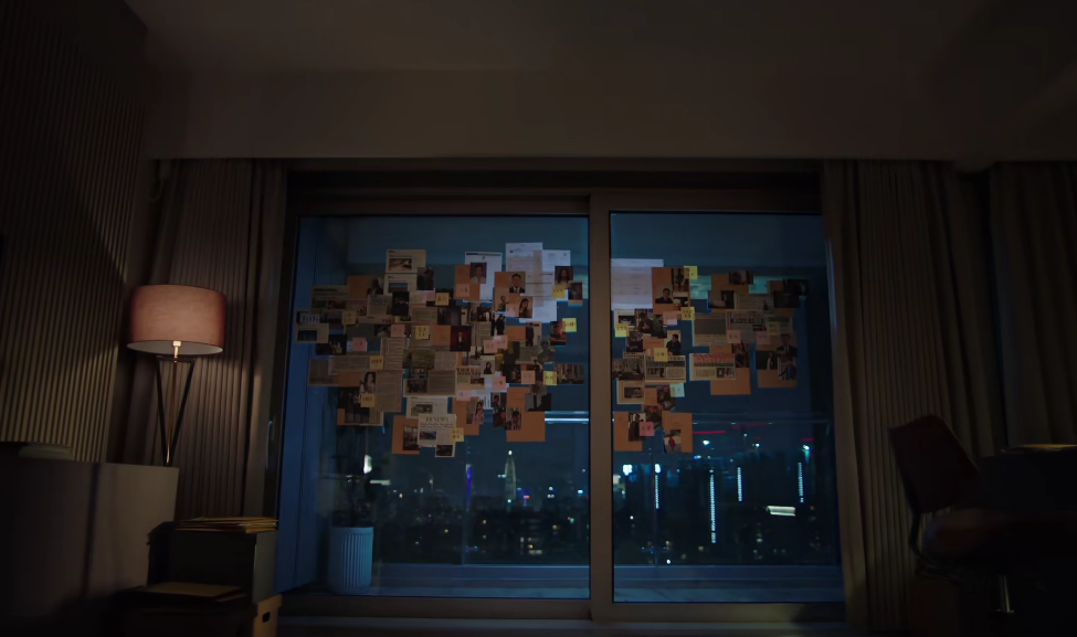 在满月的家里有一面玻璃,上面贴满了各种关系网,每一个目标在被“处决”之前,满月都做了周密的部署。