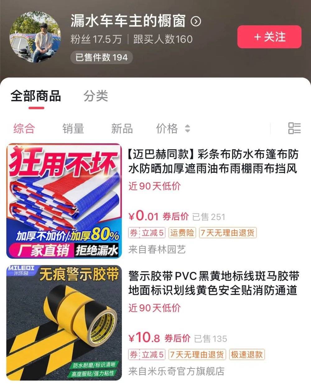 再加上之后他还有个挺有意思的举动,把篷布和胶带放自己账号橱窗了。