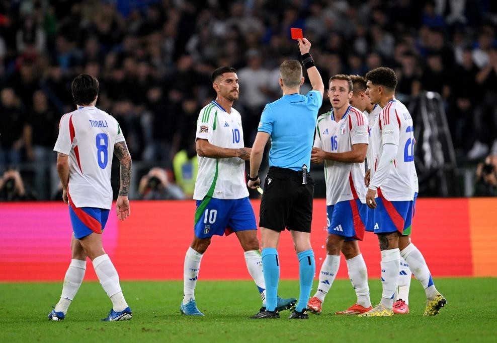 意大利上次有球员被红牌罚下还是在2018年6月,当时克里西托在主场迎战荷兰的友谊赛的第69分钟被红牌罚下,而当时1-0领先的意大利最终也被荷兰绝平。