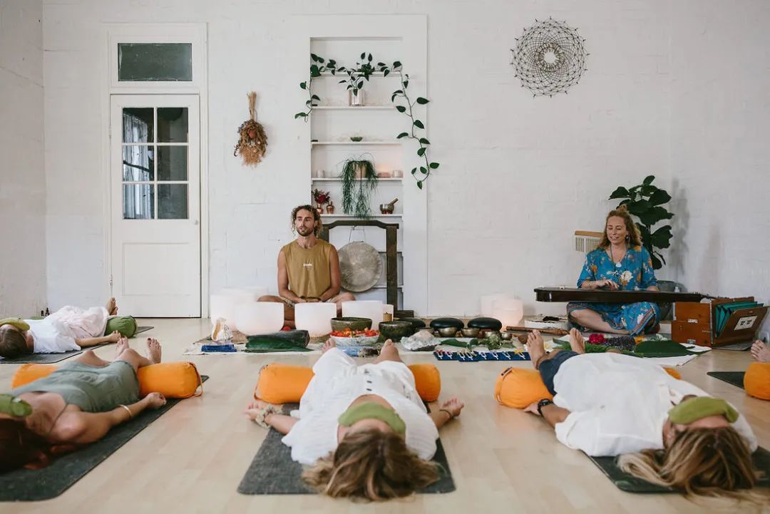 如果说团操课是给疲劳身心一剂亢奋的鸡血,那么相反的,以颂钵音疗为例的疗愈课程,正成为精致青年舒缓焦虑的身心放松活动。