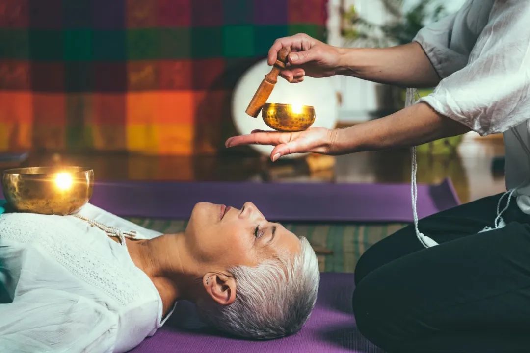 颂钵音疗时,疗愈师演奏乐器,参与者放松身心