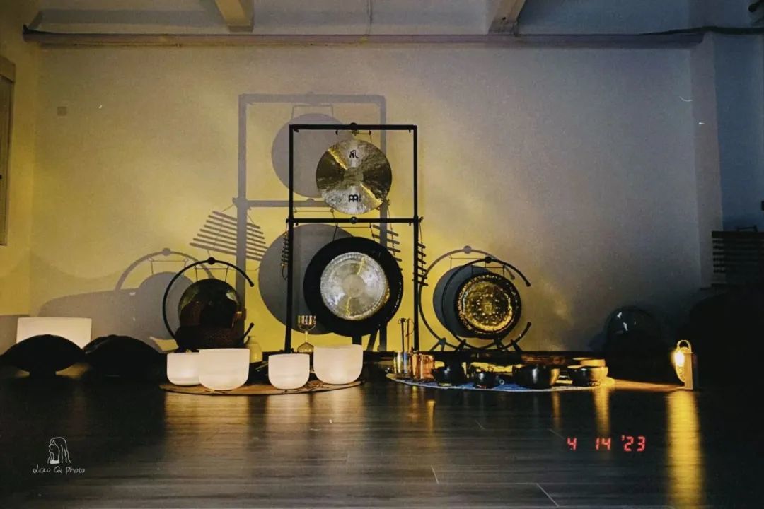 一节颂钵音疗的团课,往往会是疗愈师在演奏着几口大小各异的颂钵,面前数位参与者处于休息放松的状态,场地除了乐器发出的音乐,有时候还会有习者的鼾鸣。