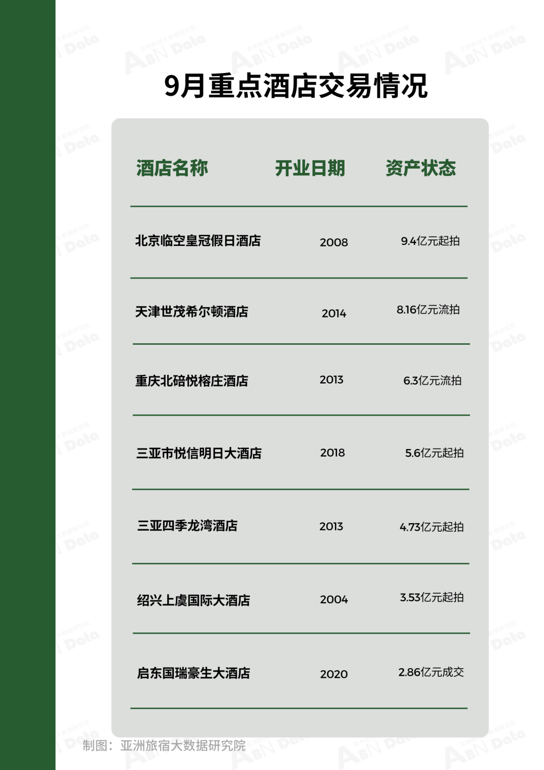 9月,ABN指数监测名录统计共有74家酒店资产处于出售、拍卖及流拍阶段,其中拍卖价格在亿元以上酒店有25家,环比上月出现明显增长,仅5家酒店最终完成交易。重点酒店交易项目有:天津生态城世茂希尔顿酒店最终以8.16亿元流拍;北京临空皇冠假日酒店拍卖,起拍价9.4亿元;重庆北碚悦榕庄酒店拍卖,起拍价6.30亿元;三亚市悦信明日大酒店,拍卖价格5.60亿元;三亚四季龙湾酒店拍卖,起拍价4.73亿元;绍兴上虞国际大酒店重整投资人资格拍卖,起拍价3.53亿;启东国瑞豪生大酒店最终以2.86亿元成交。