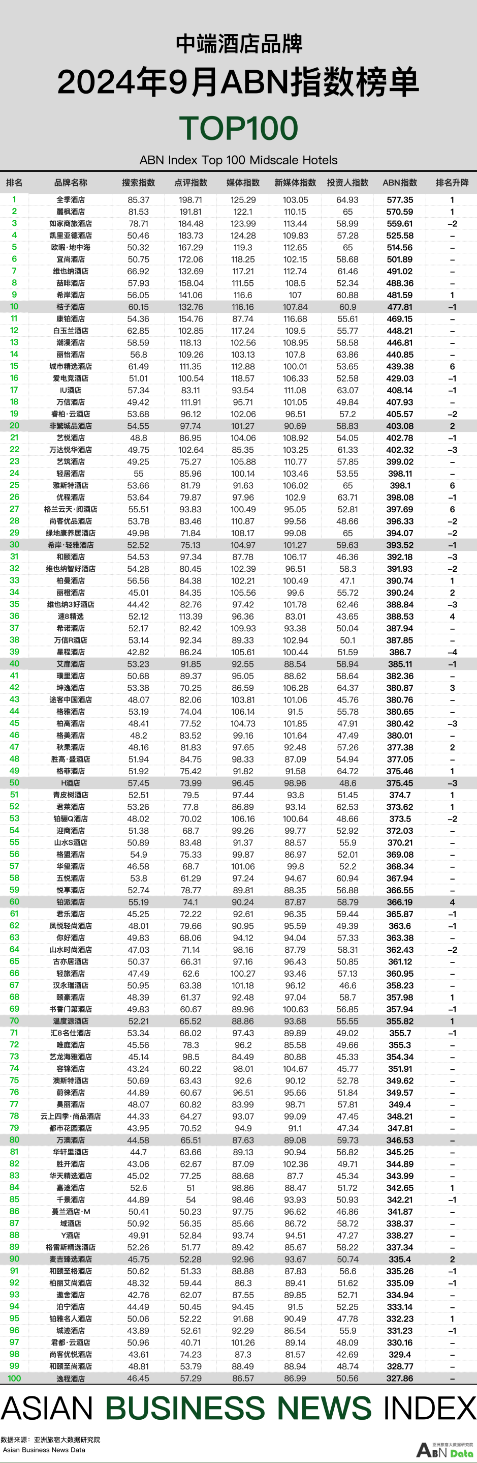 中端酒店100强榜单