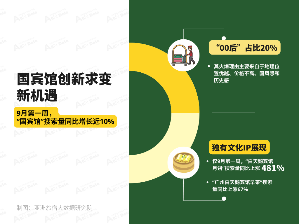 国宾馆创新求变新机遇| 有着特殊背景的国宾馆,从接待外国政的政府服务机构到对外直面住宿市场的激烈竞争挑战,近百年的发展历史过程中,在本月迎来了新的热度。据统计,9月第一周,“国宾馆”搜索量同比增长近10%,在国庆假期预订国宾馆的用户中,“00后”占比接近20%。其火爆理由主要来自于地理位置优越、价格不高、国风感和历史感独一无二。