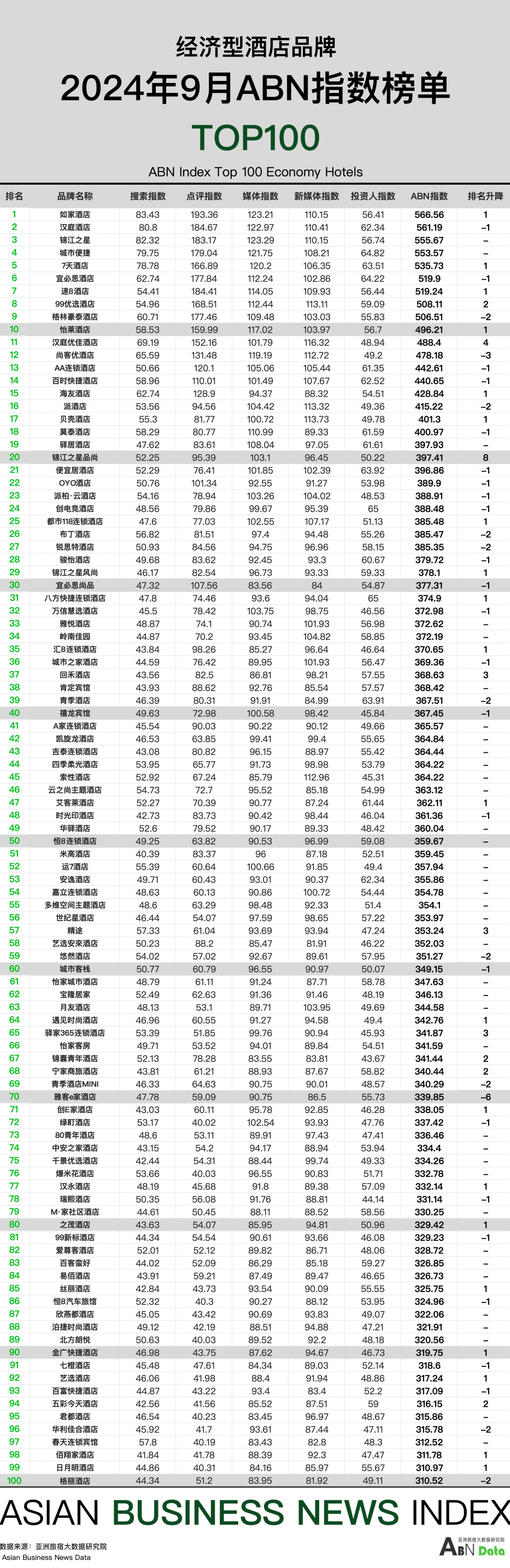 经济型酒店100强榜单