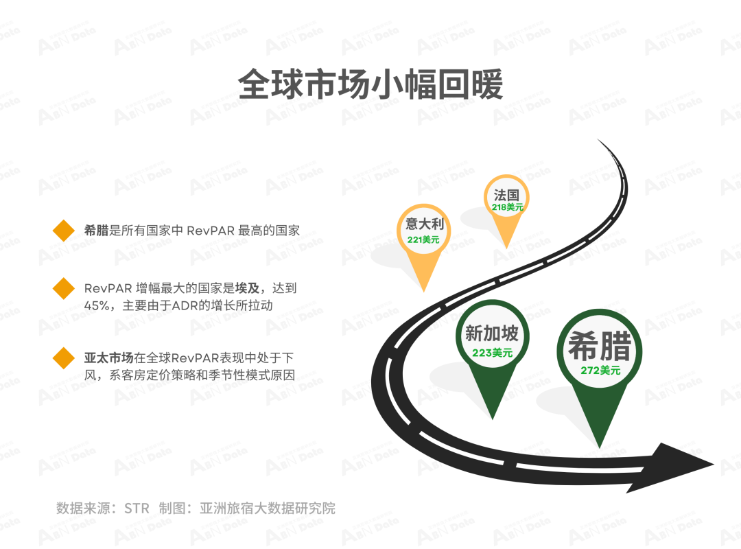 9月,全球范围内有63%的酒店市场每间可用客房收入 (RevPAR) 实现同比增长。根据STR的数据,希腊是所有国家中 RevPAR 最高的国家(272 美元),其次是新加坡(223 美元)、意大利(221 美元)和法国(218 美元)。亚太市场在全球RevPAR表现中处于下风,部分原因可能是标准化的客房定价策略和季节性模式。此外,区域经济不平衡导致酒店的区域增长模式截然不同。