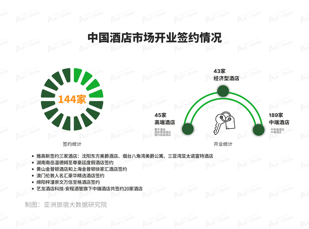 据亚洲旅宿大数据研究院监测品牌统计,本月共有144家酒店达成签约,环比上月有所回升。奢华及高端酒店板块中以国际品牌为主,其中雅高集团本月连下三城,新签约沈阳东方美爵酒店、烟台八角湾美爵公寓、三亚湾亚太诺富特酒店。另外温德姆保持落子速度,月内在湖南南岳签约温德姆至尊豪廷度假酒店,洲际酒店集团将在黄山和上海徐家汇签约2家金普顿酒店,并在浙江落子首家逸衡酒店。值得一提的是,万豪国际签约金沙中国,将豪华精选酒店品牌引入澳门。中高端酒店中,首旅酒店新签约绵羊梓潼崇文万信至格酒店,福朋喜来登酒店签约广州万科黄埔新城。艺龙酒店科技-安程酒管旗下中端酒店共签约20家酒店,包含4家艺龙安悦酒店、11家艺龙安云酒店、2家艺选安來酒店和艺选酒店以及1家美豪酒店。