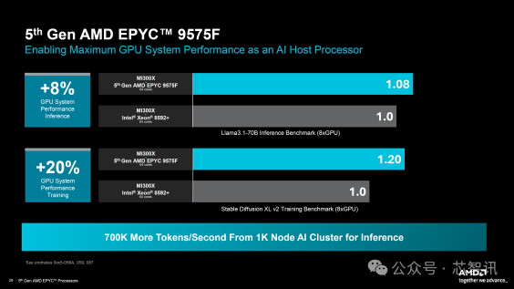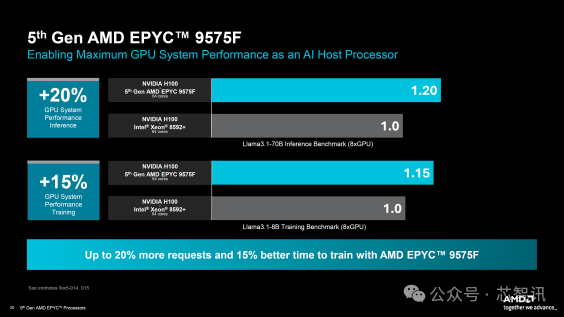 AMD 还将其 EPYC 平台用作 AMD Instinct 和 NVIDIA MGX/HGX 平台的 AI 主机 CPU。该解决方案可以配备多达8个OAM MI300X或MI325X GPU以及使用EPYC 9575F 5 GHz芯片的配置,并且可以在AI推理中实现高达20%的性能提升,在训练中实现高达15%的提升。